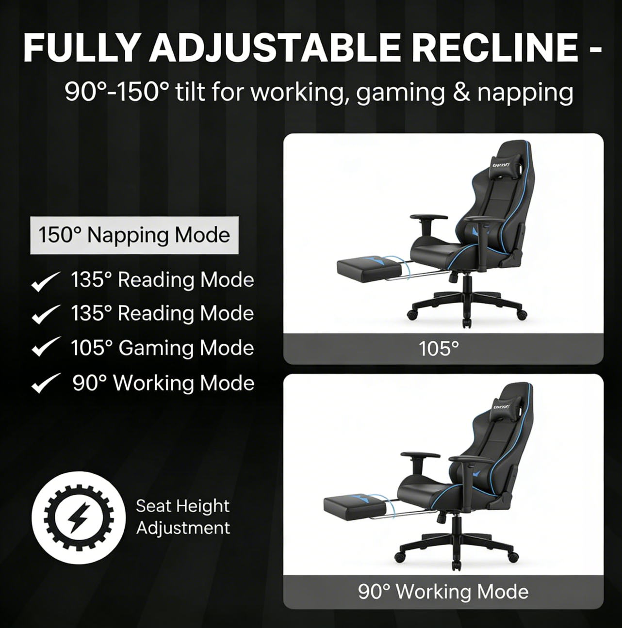 High Quality Materials : The Cushion, Backrest and Armrest of The Computer Game Chair are Filled with High-Density Foam and Made of Soft, Breathable and Colorful Pu Leather.Essential Features:You can Achieve a 135 ° Tilt, Provide You with Support. Smooth Rolling Wheels and 360 Degree Rotation. Height Adjustable, A Sturdy and Durable Steel Base