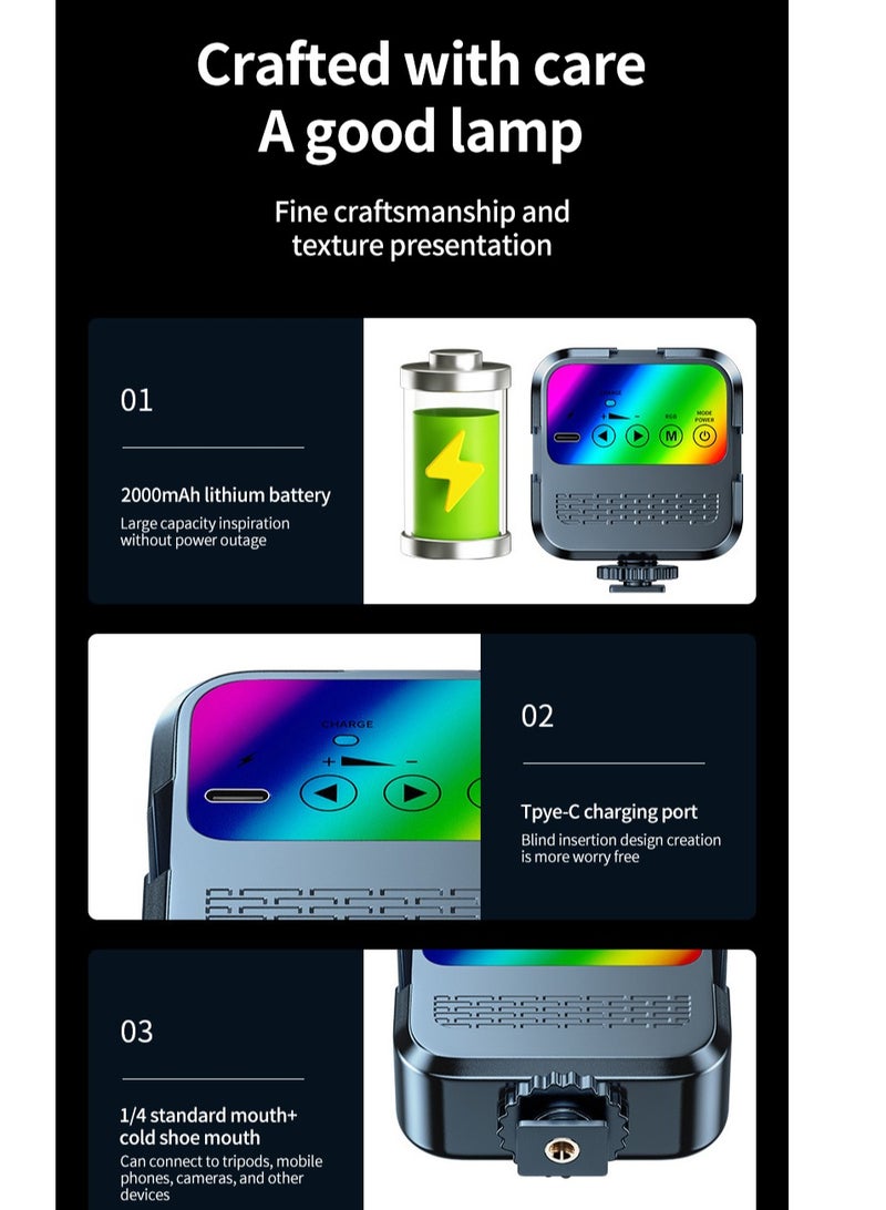 - تسع ميزات مطورة: من الإضاءة الدافئة إلى الباردة ، بطارية مدمجة ، حبات LED عالية الجودة ، ضوء ملء RGB ، زاوية قابلة للتعديل ، CRI 95 + ، اتصال متعدد المصابيح ، إلى وضع المؤثرات الخاصة-كلها متضمنة بحجم راحة اليد