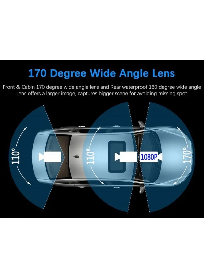 • 360° Dash Cams Front and Rear: 3 Channel dashcam built in 170° + 110° + 140° wide viewing angle lens to cover front, cabin and rear road view simultaneously, ensuring high-definition recording; The 170 ° ultra wide angle can cover 6 lanes, effectiv